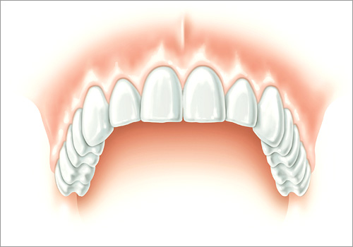 Auf mindestens sechs Implantaten kann auch eine Brücke dauerhaft an Ihrem Kiefer verankert werden. Der Zahnersatz sitzt dann so fest, dass auf den stützenden rosa Prothesenkunststoff verzichtet werden kann. Im Oberkiefer bleibt in jedem Falle der Gaumen frei von Prothesenmaterial.